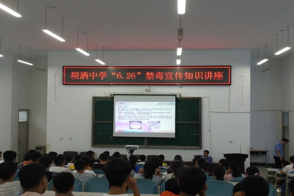 在坝洒中学,县禁毒大队大队长周利警官结合禁毒宣传短片和图片,通过演示PPT、实物展示的形式向学生们介绍毒品的种类、如何识别合成毒品和防范毒品的方法,让学生们在轻松愉快的环境中学习防毒知识。