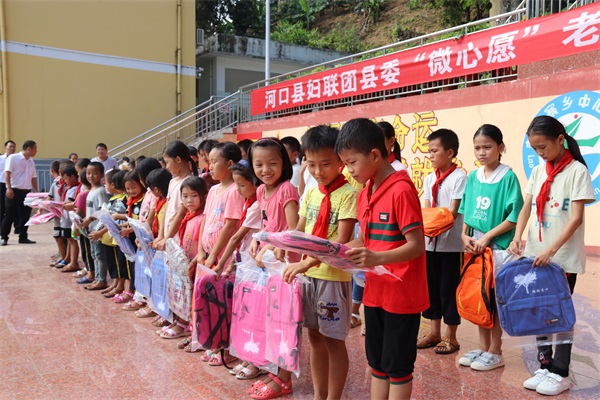 捐赠仪式现场,机关干部和爱心人士代表把凝聚着来自县人大、合群社区、县地税局、县检察院、县扶贫办、红河日报等社会各界的微心愿的16个书包、20件衣服、3套运动服传递到39名贫困儿童的“心中”。用社会的关心和真诚,让爱心流动,让温情传递,让贫困儿童感受到爱,实现他们梦寐以求的向往和期待。