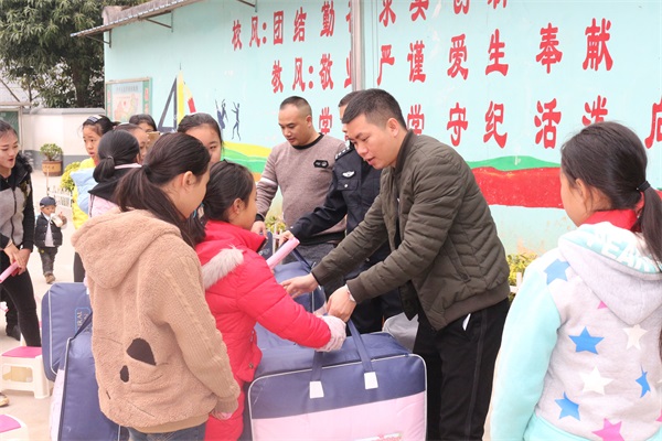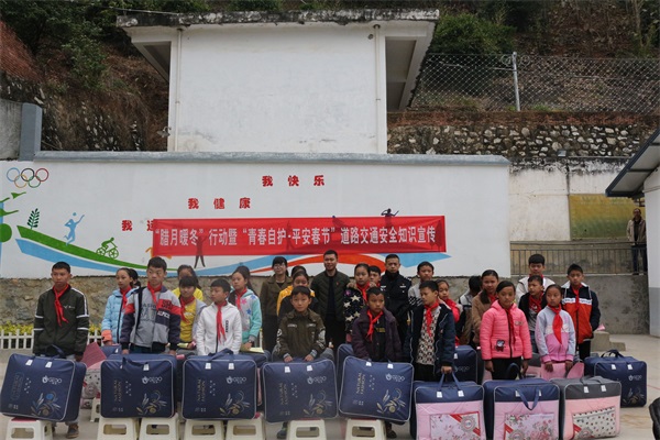 知识宣传结束,河口团县委书记盘健同志、县交警大队桥头中队中队长许家停同志和莲花滩乡党委副书记谢圆圆同志为莲花滩乡35名建档立卡贫困户子女、单亲家庭子女和留守儿童送上棉被和床上用品,让他们在寒冬里感受到团组织的温暖,感受到党的关怀,进一步巩固了团委“腊月暖冬”品牌效应。