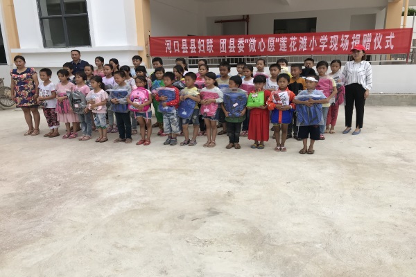 7月5日早上,河口县妇联、团县委向莲花滩小学捐赠“心愿礼物”仪式在莲花滩小学举行。河口县关心下一代办公室邓佳萌主任、莲花滩乡妇联李涛主席、莲花滩小学吕选明校长向受捐赠的学生们送上“心愿礼物”。