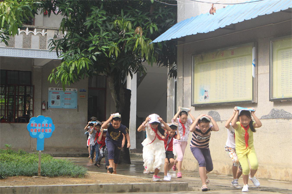 随着一声传递“地震了”的哨响,教师们迅速组织学生用书本、书包护住头颈,蹲到课桌下躲避;在收到“有序撤离”的哨声提示后,各班学生在教师的带领下有序地撤离到空阔的操场上。在整个撤离过程中,教师组织得当、学生撤离有序,未出现拥堵、踩踏的现象。